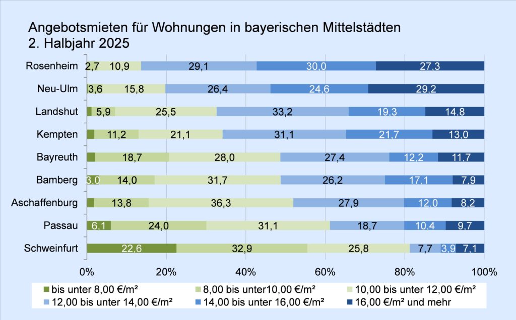 Die bayerischen Mittelstädte überzeugen häufig durch ein breites Bildungs- und Arbeitsplatzangebot sowie vielfältige Freizeitmöglichkeiten. Rosenheim, Neu-Ulm, Landshut und Kempten genießen bei Wohnungssuchenden besondere Beliebtheit. Im 2. Halbjahr 2025 lag der Anteil der Mietwohnungen unter 12 €/m² in diesen Städten zwischen 14 % und 34 %. Die fränkischen Mittelstädte Bayreuth, Bamberg und Aschaffenburg bewegten sich mit rund 50 % im Mittelfeld des Rankings. Im niederbayerischen Passau war das Angebot an Mietwohnungen unter 12 €/m² mit etwa 60 % deutlich größer. Eine Sonderstellung nahm Schweinfurt ein: Hier lagen über 80 % der angebotenen Mietwohnungen unter 12 €/m².