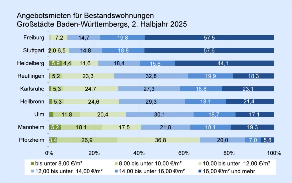 Die Landeshauptstadt Stuttgart und die südbadische Großstadt Freiburg im Breisgau sind bei Wohnungssuchenden besonders gefragt. Im 2. Halbjahr 2025 verzeichneten die beiden Städte mit 8 % bis 9 % den geringsten Anteil an Angebotsmieten für Bestandswohnungen in den Preiskategorien unter 12 €/m².
