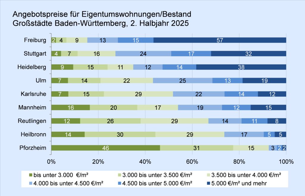 Unter den Großstädten Baden-Württembergs stechen Pforzheim, Heilbronn und Reutlingen mit vergleichsweise käuferfreundlichen Preisen hervor: Hier lag im zweiten Halbjahr 2025 die deutliche Mehrheit der angebotenen Eigentumswohnungen unter 4.000 €/m². Im Mittelfeld des Großstadtvergleichs folgten Mannheim, Karlsruhe und Ulm. Hier blieb rund die Hälfte der angebotenen Eigentumswohnungen unter der 4.000 €-Marke,“ so Prof. Stephan Kippes, Leiter des IVD-Marktforschungsinstituts. „Zu den teuersten Städten gehörten Freiburg, Stuttgart und Heidelberg. In diesen Städten war nur etwa ein Drittel oder weniger der Angebote den günstigeren Preiskategorien zuzuordnen.“