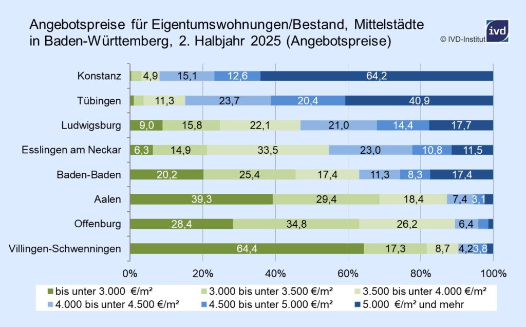 “Unter den großen Mittelstädten in Baden-Württemberg stechen die beiden Universitätsstädte Konstanz und Tübingen mit ihrem verhältnismäßig hohen Preisniveau für Eigentumswohnungen aus dem Bestand hervor – ein Großteil der Objekte wurde hier in der zweiten Jahreshälfte 2025 für 4.000 €/m² und mehr am Markt offeriert,“ so Prof. Stephan Kippes, Leiter des IVD-Marktforschungsinstituts. „In Ludwigsburg, Esslingen am Neckar und Baden-Baden teilen sich die angebotenen Eigentumswohnungen relativ ausgeglichen auf die untersuchten Preisniveaus auf, während in Aalen, Offenburg und Villingen-Schwenningen die meisten Objekte unter 4.000 €/m² lagen.“