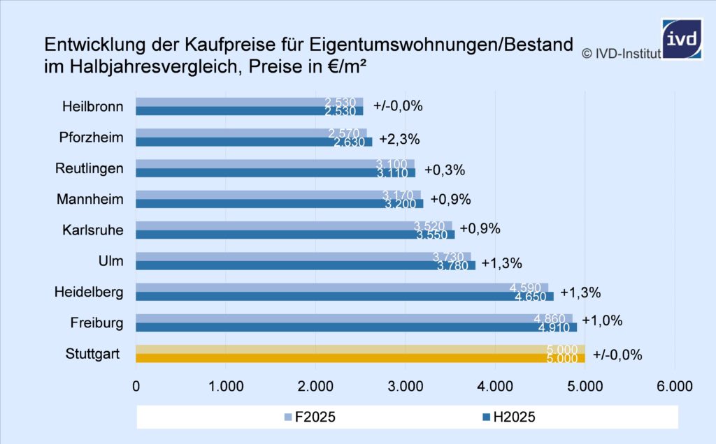 Im Herbst 2025 verzeichnen Pforzheim (+2,3 % gegenüber Frühjahr 2025) sowie Heidelberg und Ulm (jeweils +1,3 %) die höchsten Preiszuwächse im Marktsegment Eigentumswohnungen im Großstadtvergleich Baden-Württembergs. Alle weiteren Großstädte weisen entweder leichte Anstiege von maximal +1 % (Reutlingen, Mannheim, Karlsruhe und Freiburg) oder konstante Preise (Stuttgart und Heilbronn) auf.