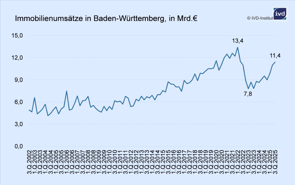 Die Entwicklung der Immobilienumsätze in den ersten drei Quartalen 2025 bestätigt den anhaltenden Erholungstrend auf dem Wohnimmobilienmarkt in Baden-Württemberg. Diese Tendenz wird sich laut der IVD-Hochrechnung fortsetzten. Das Jahresergebnis aus dem Jahr 2024 mit insgesamt 36,3 Mrd.€ wird aller Voraussicht nach deutlich überschritten. Das Umsatzvolumen könnte sich bis Jahresende 2025 bei rund 43 Mrd. € einpendeln.