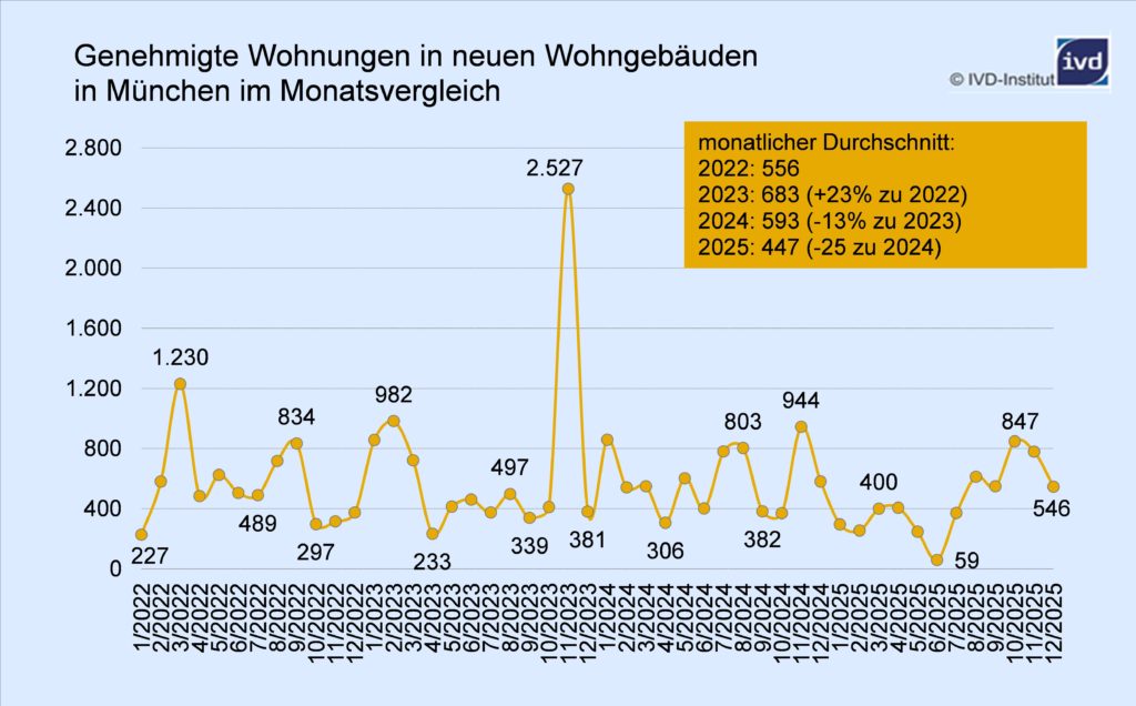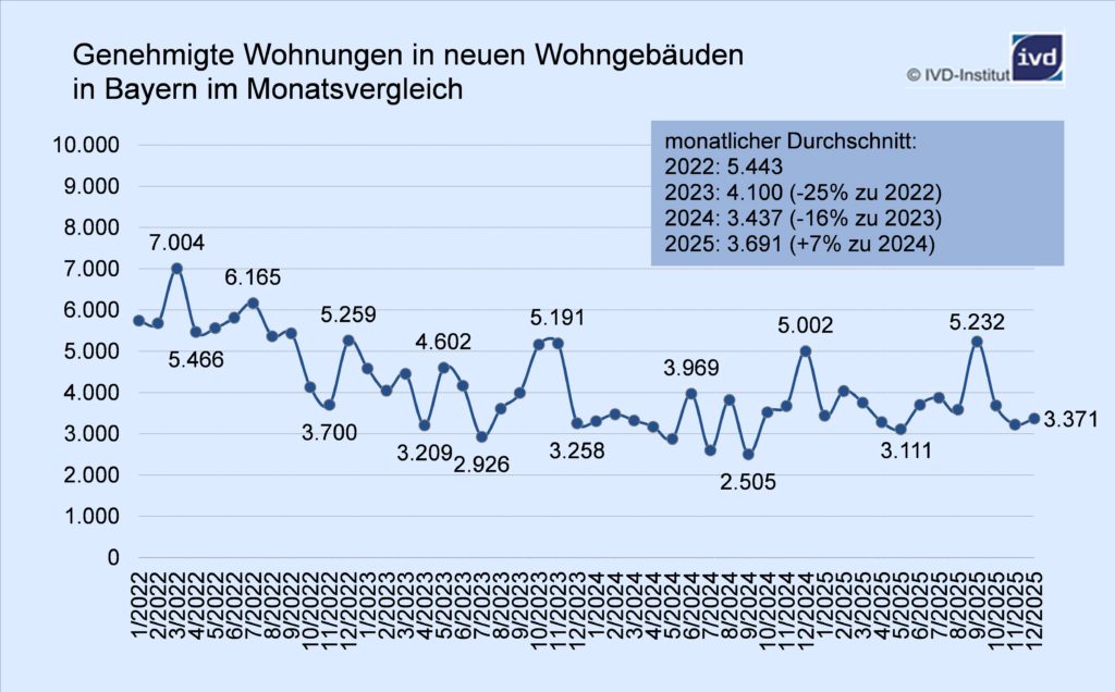 Redaktioneller Hinweis: Das IVD Institut bezieht sich in seiner Analyse auf genehmigte Wohnungen in neuen Wohngebäuden. Die Genehmigungszahlen basieren auf dem Bayerischen Landesamt für Statistik. Die Jahreswerte für 2025 beruhen auf vorläufigen Berechnungen, unter Umständen kann es zu kleineren nachträglichen Korrekturen der Zahlen, zum Beispiel durch Nachmeldungen, kommen.